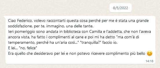 ora sono passati 4 mesi e Camilla è una cagnolina felice, che fa il cane, che sta facendo molte esperienze e che sa che seguendo i suoi padroni sarà sicura e non dovrà preoccuparsi di nulla.
